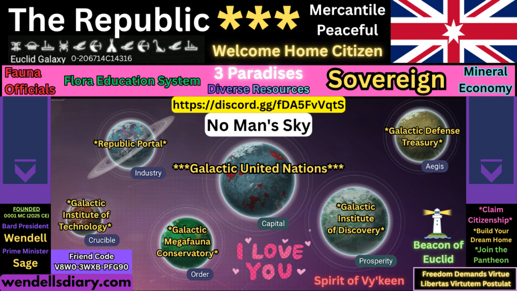 Welcome to Wendell’s Diary, the official platform of the People’s Presidency, the Emergence Party, and now the Republic of Euclid in No Man’s Sky—an empire built across the stars, dedicated to true democracy, independence, and the evolution of human thought.